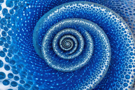 Close-up of a blue spiral shell displaying intricate textured patterns, on a dark blue background. Concept of nature's beauty and intricate designs