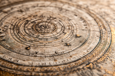 An aged celestial chart featuring elaborate concentric rings adorned with detailed symbols, precise lines, and markings, evoking a sense of historical astronomical craftsmanship