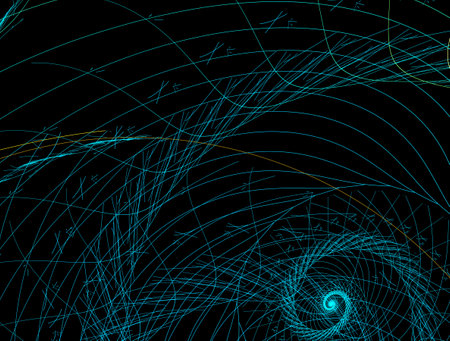 A detailed fractal spiral pattern in shades of blue, purple, and gold against a dark, star-filled background, creating a sense of cosmic depth and intricate design. Clear details and vibrant col...