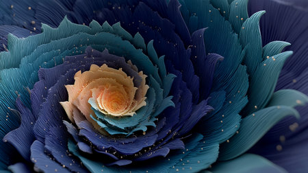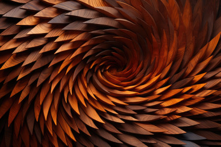 An abstract spiral pattern features a golden-brown textured design over a teal background. The intricate arrangement suggests growth or expansion. The artwork uses detailed textures with dynamic lighting. Its design is suitable for various applications, including print and digital media, and can be used to convey concepts such as growth or elegance.