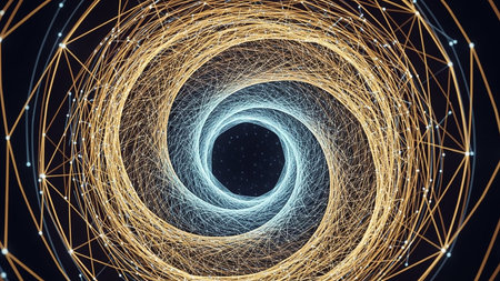 An abstract swirling tunnel of interconnected golden and blue geometric lines with glowing dots creates a sense of depth and digital motion.
