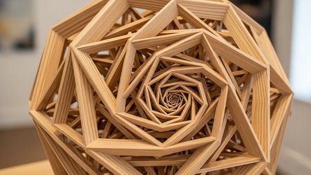 A complex wooden sculpture featuring a spiraling, nested geometric structure that creates a fractal-like appearance.