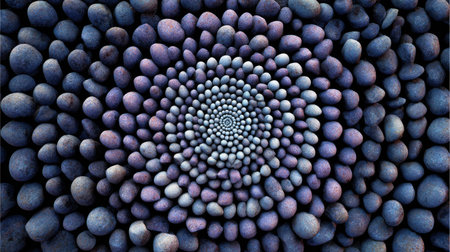 An overhead view reveals a mesmerizing spiral composition formed by numerous rounded rocks. The color palette predominantly features shades of blue and purple. The composition, marked by its depth, suggests a textured surface. Suitable for use in a variety of visual projects requiring a distinctive background or pattern.