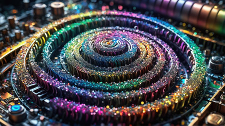 An AI generated illustration of A close-up of colored, round electronic components situated in the center of a computer motherboard