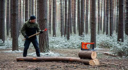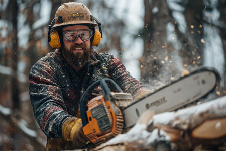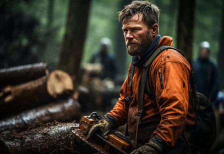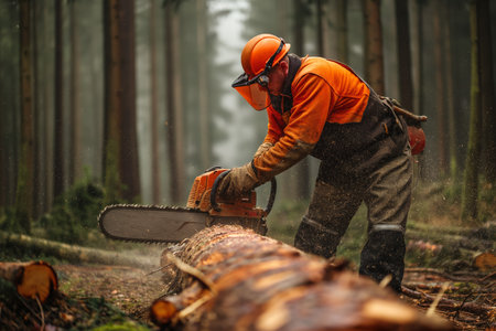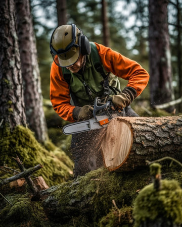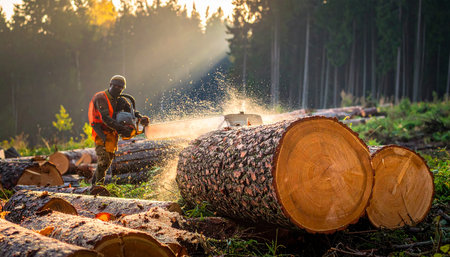 Gleaming chainsaw wielded by lumberjack surrounded by pine trees