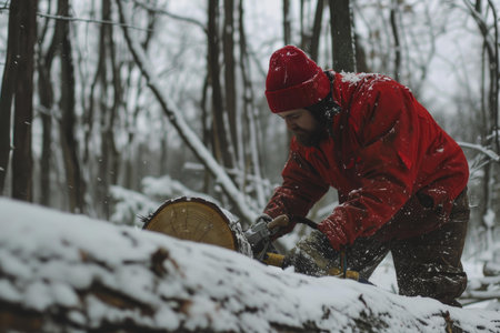 Focused lumberjack saws through a log in a snowy, winter woodland scene