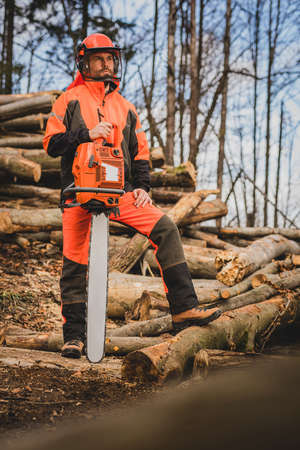 Professional lumberjack with protective workwear and chainsaw working in a forest