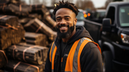 Portrait of a cheerful young African American man wearing a safety vest, smiling at a construction site with equipment in the background.