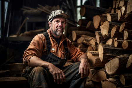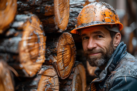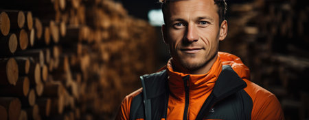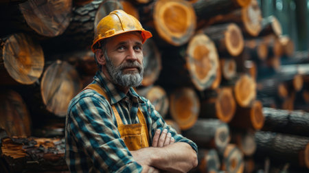 A mature lumberjack with crossed arms, posing in front of piled wooden logs.