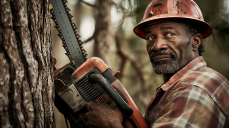 Portrait of an African-American lumberjack with a chainsaw