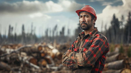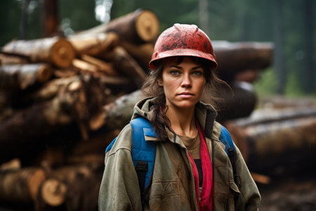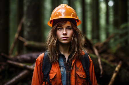 Young logging worker woman at work. Generative AI.