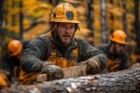 Diverse team of forestry workers in action wearing yellow gear