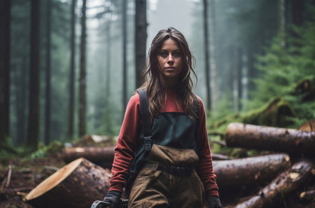 Outdoorsy Logger woman forest. Machine beauty female. Generate AI
