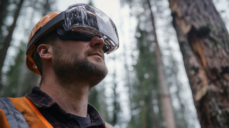 Forest Worker Using Safety Gear During Timber Inspection in Remote Woodland
