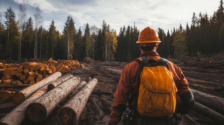 Forest Worker Inspecting Timber Yard at Sunset in Northern Woodland