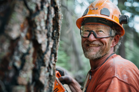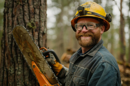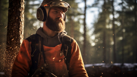 Confident lumberjack wields chainsaw majestic pine trees