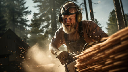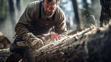 An AI generated illustration of a man using a handheld saw to cut a log of timber