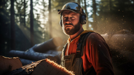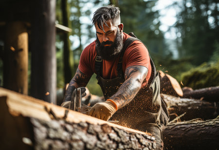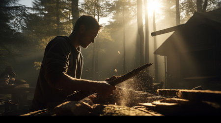 An exceptionally focused and dedicated craftsman skillfully shapes logs under the warm glow of forest sunlight. Generative AI