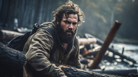 Stylish severe bearded man amid a pile of logs, posing like lumberjack