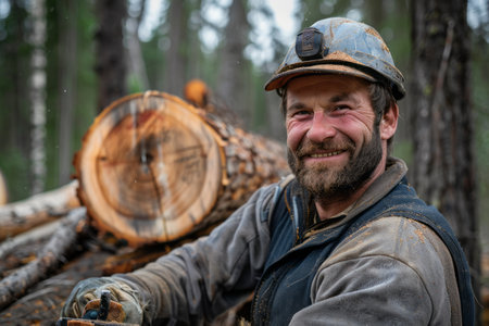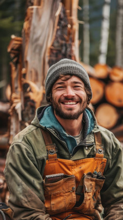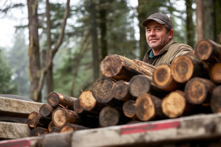 Cheerful man hauls a load of freshly cut logs, poised against a misty forest backdrop, embodying a rugged outdoor work lifestyle