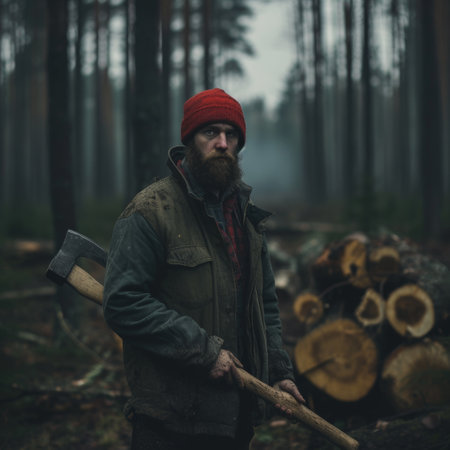 A person in a forest, holding an axe, with a stack of cut logs in the background, evoking a moody atmosphere