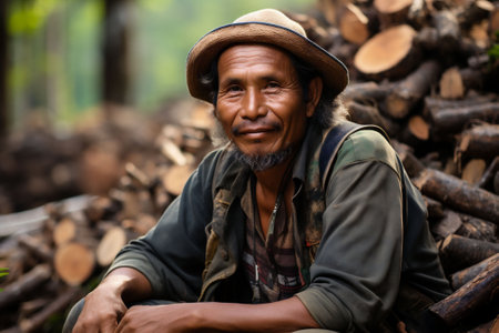 A black smiling asian working class man sitting on a chopped up wood pile with a hat in a dark shirt. Deforestation in progress. Copy space. High quality photo