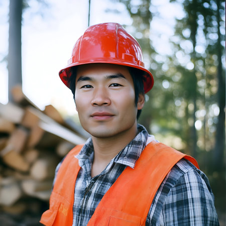Portrait of young Asian lumberjack worker in red safety helmet standing in forest.
