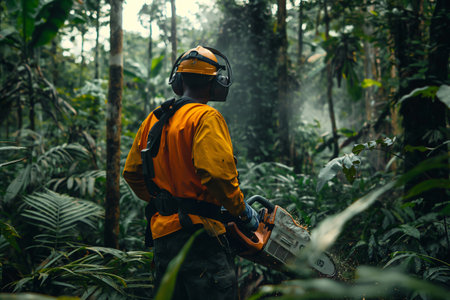 Lumberjack wearing safety gear is using a chainsaw to cut down trees in a rainforest