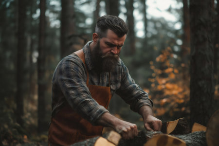 Lumberjack wearing a leather apron is skillfully splitting wood with an ax in a serene forest, embodying traditional rural life