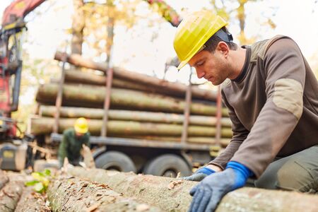 Forest worker or lumberjack at the wood harvest in the forest with tree trunk