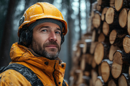 Logger wearing safety gear standing near pile of logs in a snowy winter forest