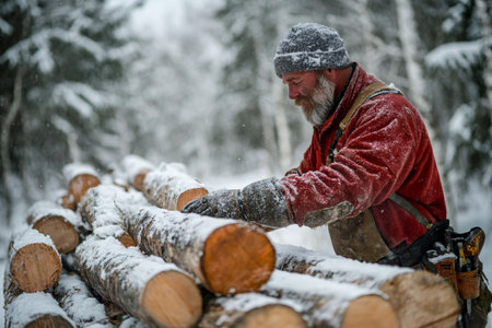Lumberjack carefully placing logs on a pile during snowfall in a winter forest