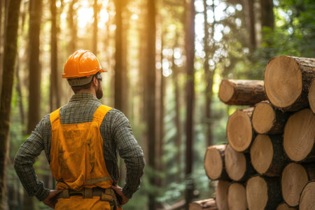 Worker in safety gear observes lumber stacks amidst tall trees in a forest at dawn.