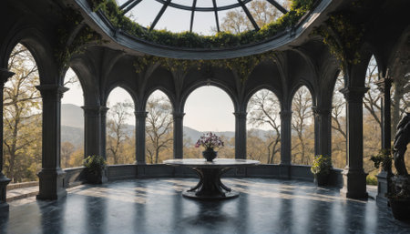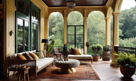 A bright and elegant interior featuring arched windows that invite ample natural light. The serene setting creates a peaceful ambiance, perfect for relaxation.