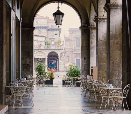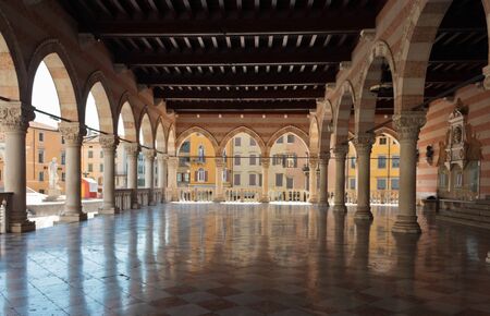 The scenic view on Piazza delle Erbe from the loggia which is the external balcony of Palazzo della Ragione in Padua, Veneto, Italy, Europe. Light beams on beautiful colonnade with column architecture