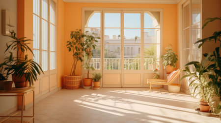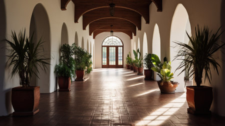 Interior of a beautiful hall with arched windows and plants in pots
