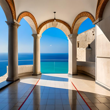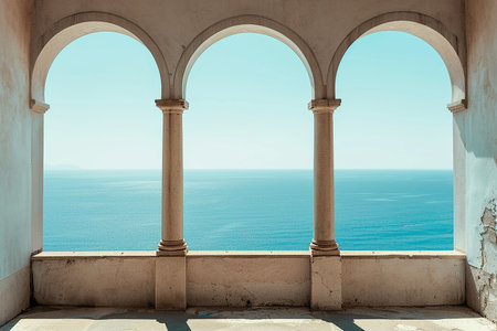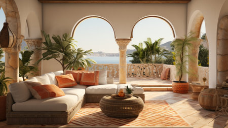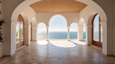 Luxurious ocean view patio with elegant archways and cozy seating on a sunny day. That the image is generated using AI.