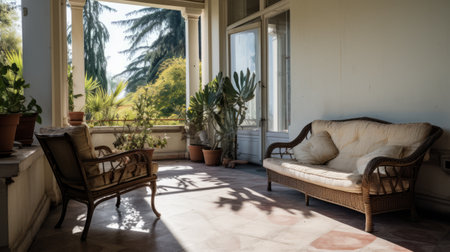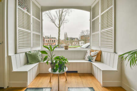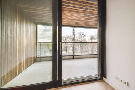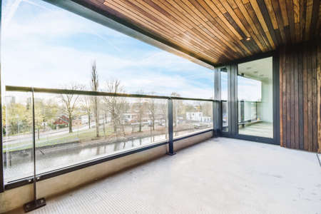 Interior of a small glazed terrace in apartment building : Generative AI