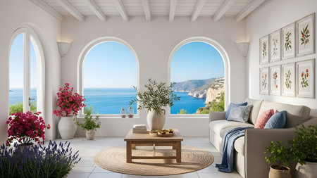 Interior of luxury villa with sea view.