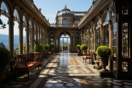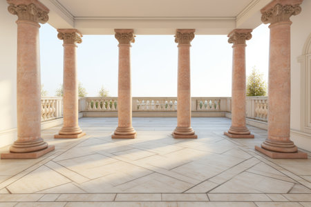 Elegant pillars and ornate ceiling of a European palace, open space