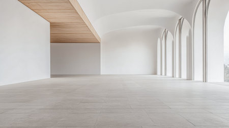 Minimalist empty room with large arches, neutral colors and natural lighting. Architectural concept image for luxury Real Estate.