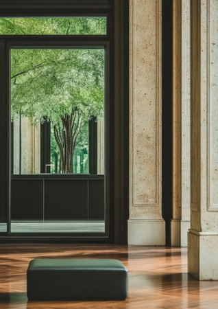 Natural light fills a spacious minimalist interior featuring wooden flooring and large windows. Outside vibrant greenery creates a tranquil atmosphere enhancing the serene ambiance.