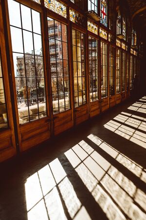 San Pau hospital-Barcelona-Catalonia, Glazed corridor inside Hospital de la Santa Creu i Sant Pau, designed by Lluis Domenech i Montaner. Feb 2019