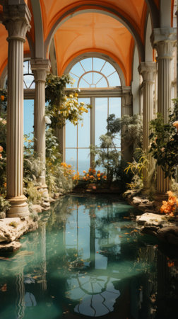 European style greenhouse with a large reflecting pool