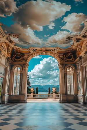 View from an Ornate Archway with a Checkered Floor