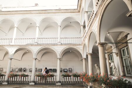 Lovely happy wedding couple, bride with long white dress posing in beautiful city.