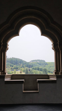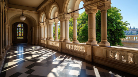 This stunning interior view showcases a historic building's corridor with arched windows, allowing light to create dynamic shadows. The scene features lush greenery outside.