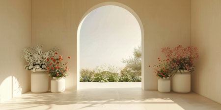 Minimalist Cream Arched Wall Soft Sunlight Serene Backdrop Flower Pots Product Display