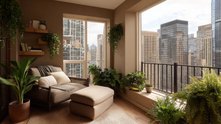 A serene urban living space featuring natural light, stylish furnishings, and abundant greenery, creating a perfect retreat in the city with stunning skyline views.