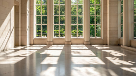 A serene and bright room featuring large windows that invite natural light and showcase views of lush greenery outside. Perfect for various design applications.